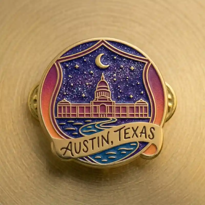 Affichez votre fierté pour le Lone Star State avec notre épinglette Austin Texas personnalisée. Parfait pour les touristes, les entreprises locales, les amateurs de musique et les boutiques de souvenirs, ce pin's est un moyen élégant de représenter Austin. Que vous créiez des articles sur le thème de la ville, des articles promotionnels ou des souvenirs, ce pin's Austin Texas est un souvenir significatif qui capture la culture et l'énergie de la ville.