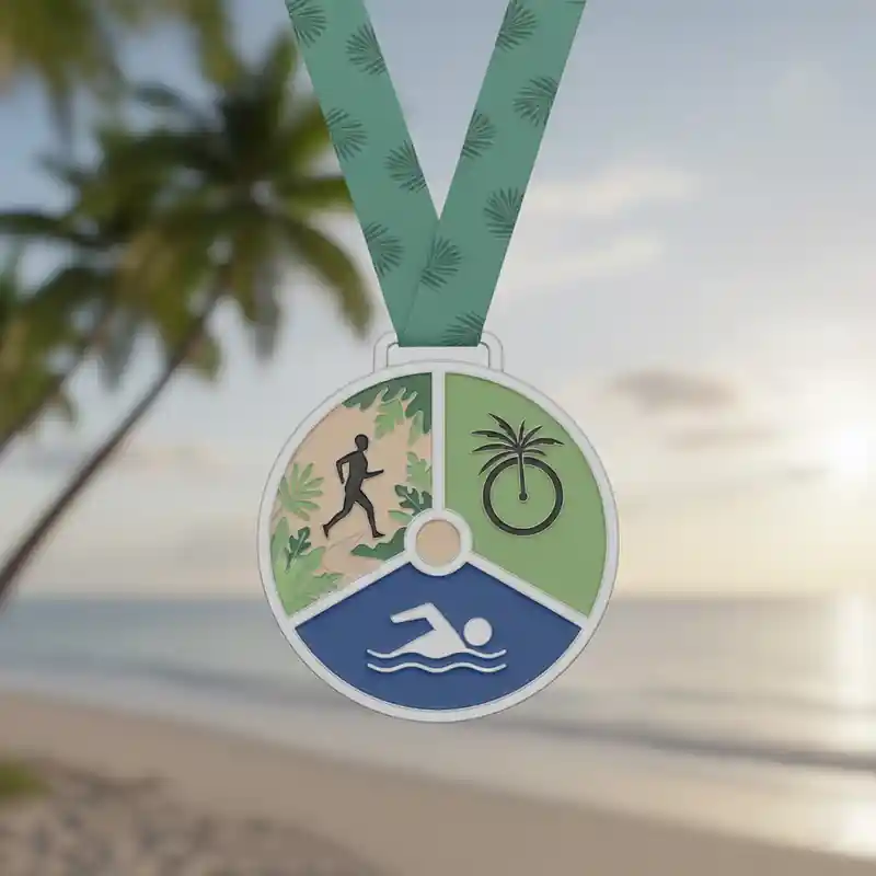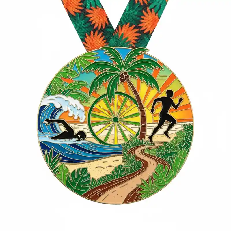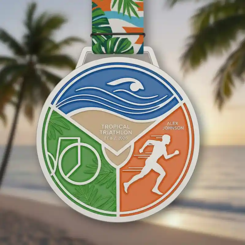 We offer full customization to match your event’s theme. Whether it’s tropical elements like palm trees, waves, and sun, or custom logos and text, every tropical triathlon medal can be tailored in size, shape, thickness, and design to fit your needs.